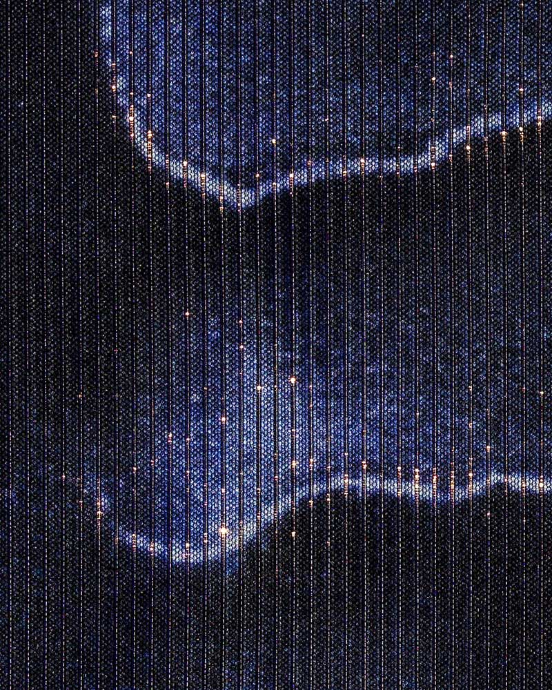 An artist intervenes directly on the activation of the optical fibers, modulating intensity, chiaroscuro, and depth according to the pattern or subject represented. Certain areas are emphasized while others are left in shadow, creating volume, visual rhythm, and a three-dimensional perception of the surface.