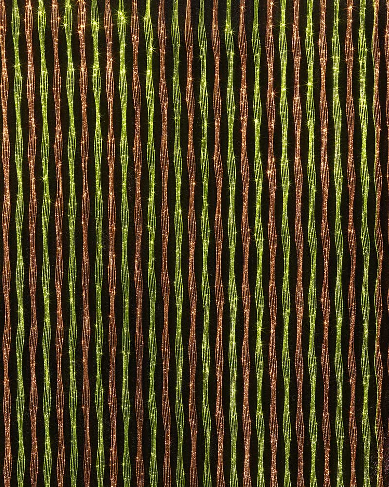 Le trame del tessuto diventano così il supporto di un dialogo luminoso tra due tonalità: le linee, i fili o i micro-punti si accendono in sequenza alternata, creando un effetto visivo dinamico fatto di vibrazioni cromatiche, profondità e movimento percettivo.
