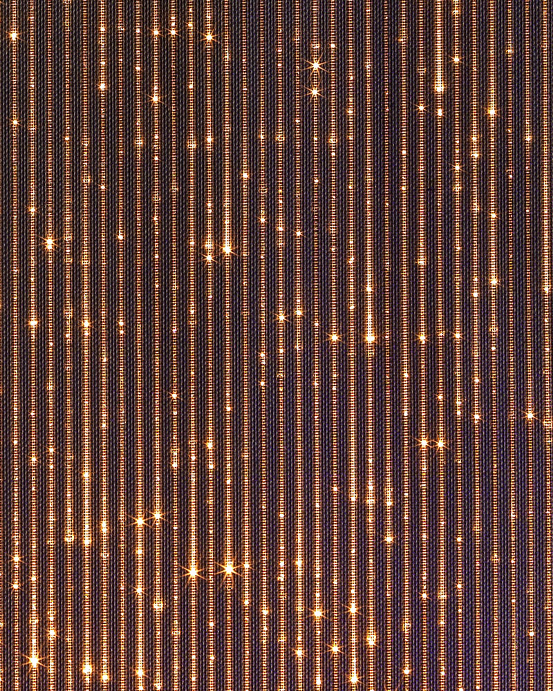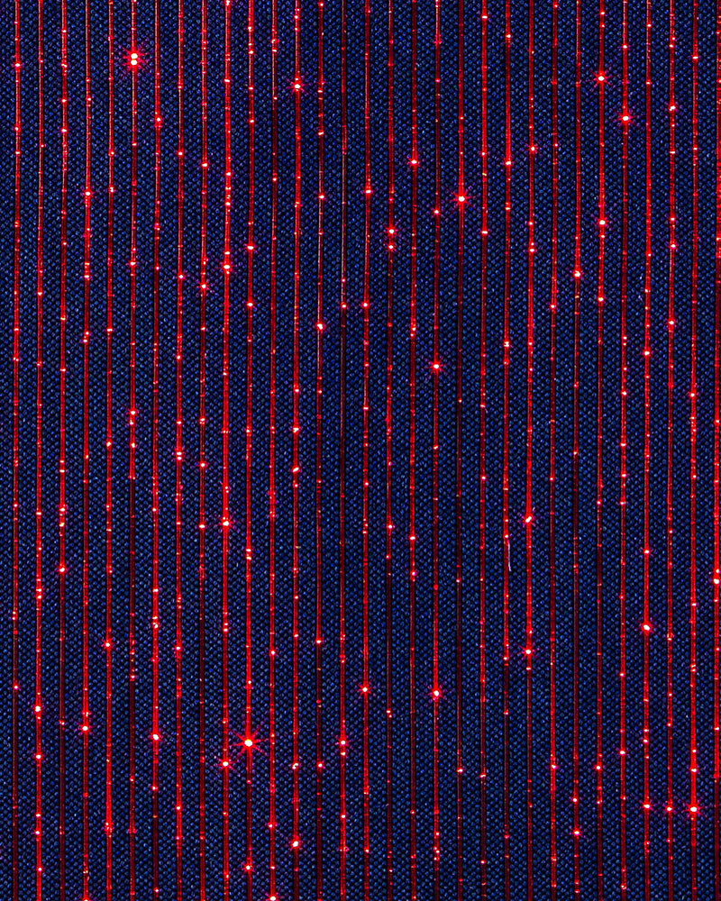 DreamLux Velo è una superficie tessile luminosa a trama compatta e regolare, caratterizzata da sottili righe verticali che creano un fondo continuo su cui la luce prende forma come una costellazione delicata. La struttura omogenea del tessuto consente alla fibra ottica di emergere in micro-punti diffusi, generando un effetto luminoso morbido e profondo, simile a un cielo stellato, capace di avvolgere lo spazio con eleganza discreta.