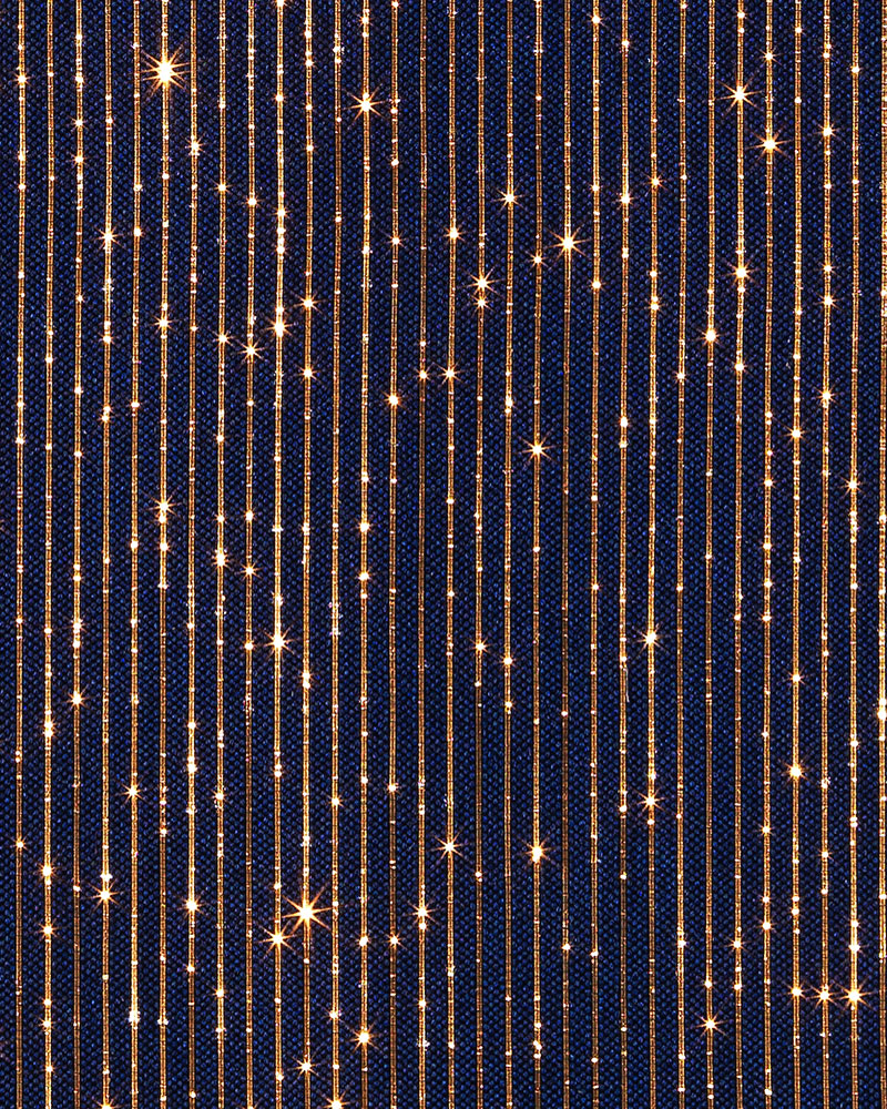 DreamLux Velo è una superficie tessile luminosa a trama compatta e regolare, caratterizzata da sottili righe verticali che creano un fondo continuo su cui la luce prende forma come una costellazione delicata. La struttura omogenea del tessuto consente alla fibra ottica di emergere in micro-punti diffusi, generando un effetto luminoso morbido e profondo, simile a un cielo stellato, capace di avvolgere lo spazio con eleganza discreta.
