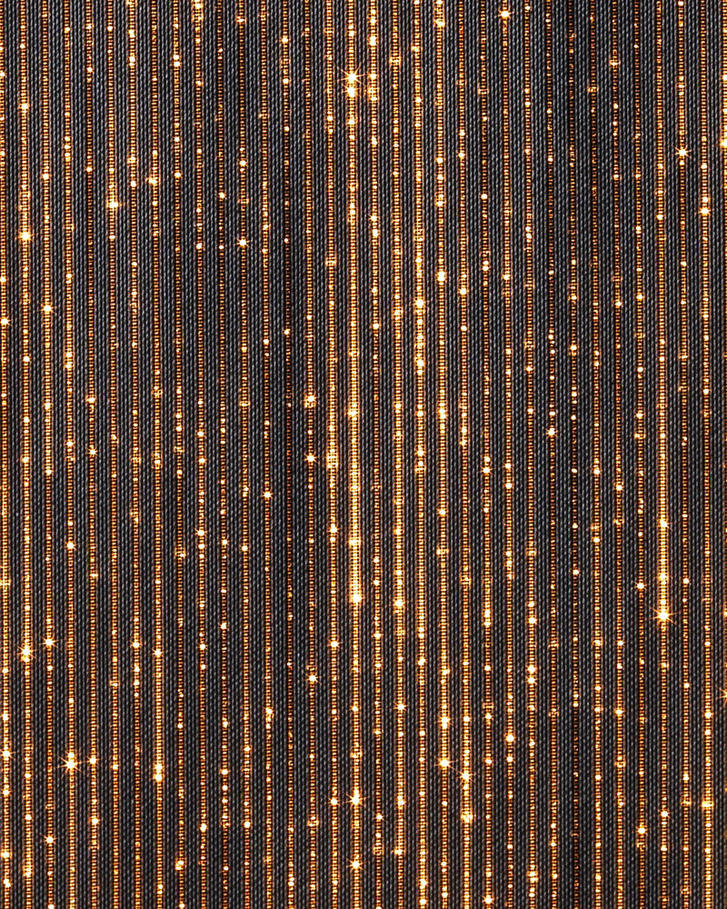 DreamLux Velo è una superficie tessile luminosa a trama compatta e regolare, caratterizzata da sottili righe verticali che creano un fondo continuo su cui la luce prende forma come una costellazione delicata. La struttura omogenea del tessuto consente alla fibra ottica di emergere in micro-punti diffusi, generando un effetto luminoso morbido e profondo, simile a un cielo stellato, capace di avvolgere lo spazio con eleganza discreta.
